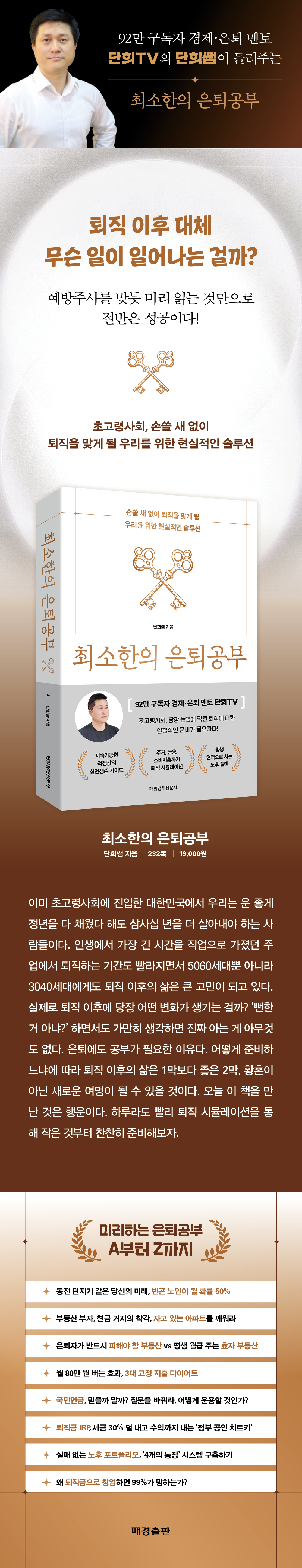 퇴직은 현실이다. 준비하지 않는다면 누구나 갑작스럽게 느껴지는 상황 앞에 한동안 당황스러워 하며 시행착오와 시간낭비를 할 수밖에 없다. 이 책은 단순한 노후 지침서를 넘어선 인생 후반부를 위한 새로운 설계도다. 화려한 성공스토리나 대단한 자산가들을 위한 투자 조언이라기보다 언젠가 퇴직을 하게 될 평범한 우리 모두를 위한 지속가능한 적정값의 실전생존 가이드다. 예방주사를 맞든 미리 읽고 퇴직 시뮬레이션을 해보는 것만으로 노후는 안전할 수 있다.